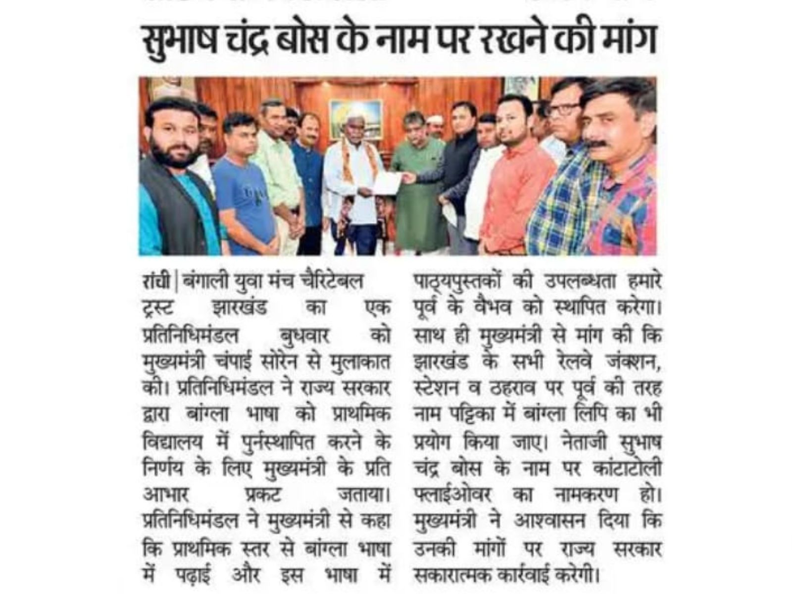 बंगाली युवा मंच चैरिटेबल ट्रस्ट के एक प्रतिनिधिनमंडल ने मुख्यमंत्री आवासीय कार्यालय में मुख्यमंत्री चंपाई सोरेन से मुलाकात की। मंच के सदस्यों ने बांग्ला भाषा को प्राइमरी स्कूलों में बांग्ला भाषा समेत अन्य क्षेत्रीय भाषाओं की पढ़ाई शुरू करने के फैसले को लेकर आभार जताया।